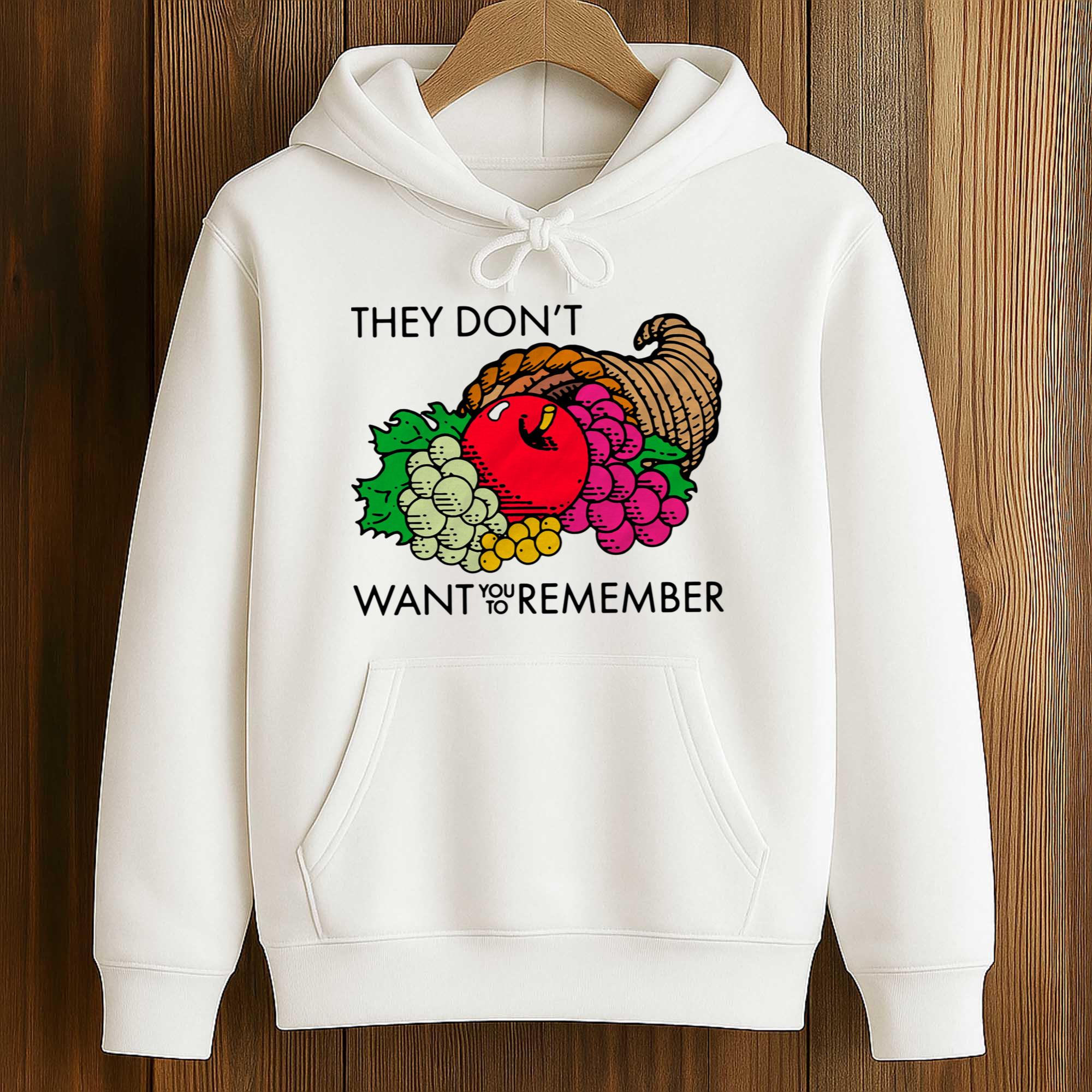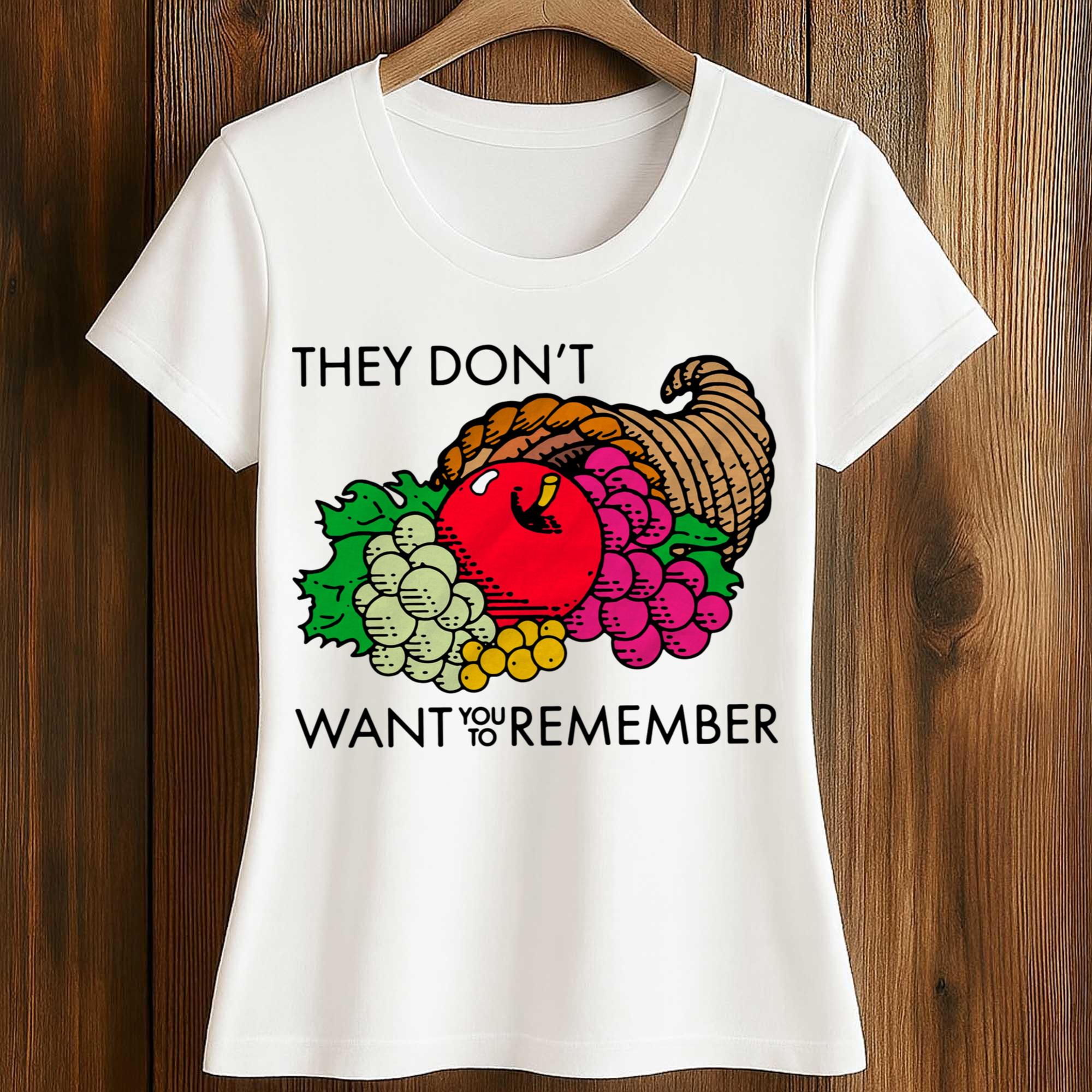 The They Don’t Want You To Remember Shirt is a casual outfit — it’s a fun Idea Tip. Featuring a fruit-filled horn design and a bold statement, this shirt combines everyday comfort with a bold message. Dressed down or layered, this shirt attracts attention and piques curiosity wherever you go.