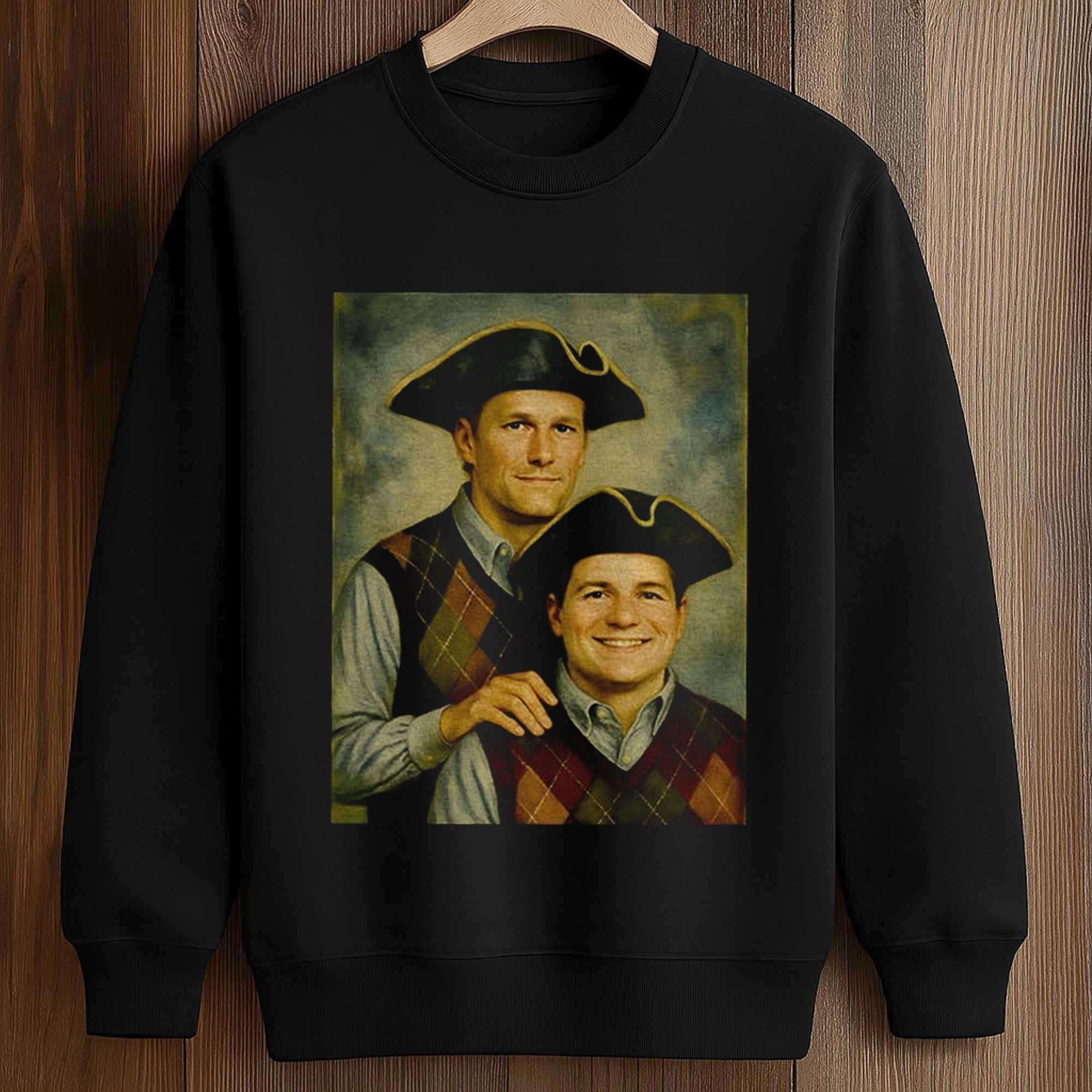 The Tom Brady Drake Maye Step Brothers Shirt brings a playful twist to fan culture with a parody-style portrait inspired by classic stepbrother-themed comedy posters. The design features two illustrated figures posing in a classic family photo style, wearing argyle sweaters and colonial-style hats. The playful mix of vintage and modern satire makes this shirt a standout choice for fans who love lighthearted sports merchandise.