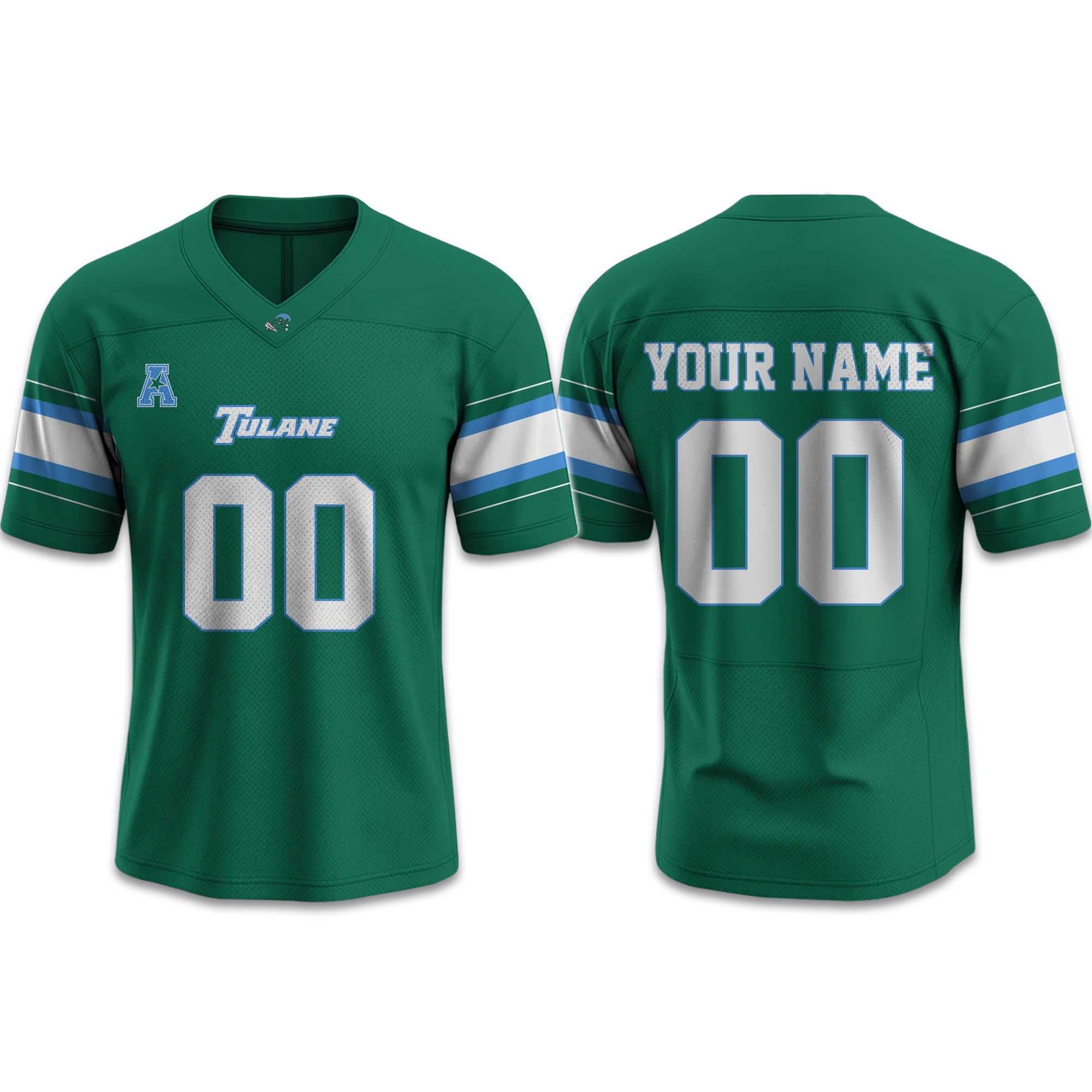 The V-neck adds a sporty look, while the sleeves add a classic Tulane touch. The crisp print, crisp details, and customizable back allow fans to create a jersey that truly reflects their personality. The strong seams and stretchy material provide lasting comfort, whether cheering in the stands or wearing casually. The smooth fabric, crisp print, and comfortable athletic fit are ideal for warmer days, practices, or football viewing events.