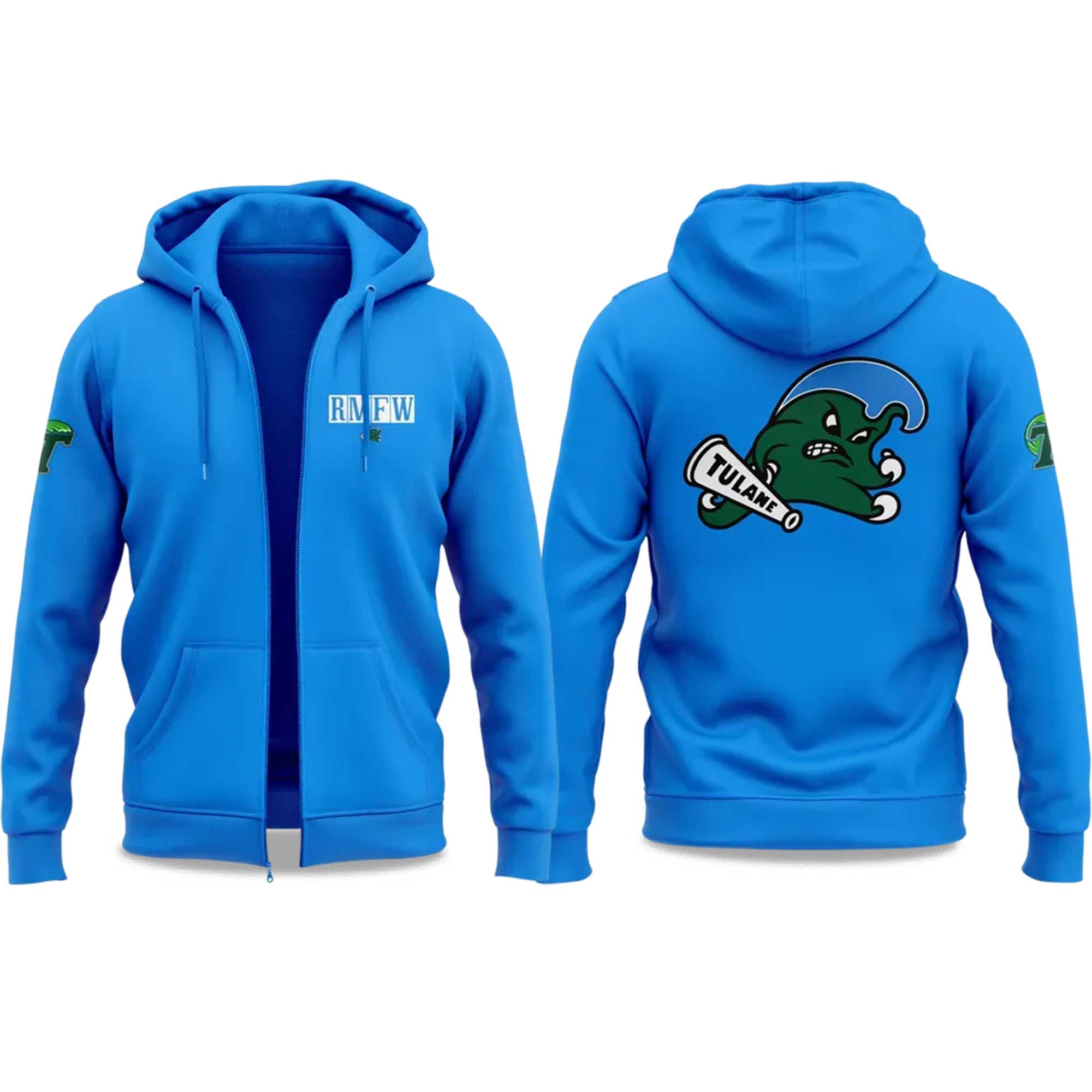 This Tulane Coach Jon Sumrall RMFW Zip Hoodie features a “RMFW” label on the chest for a subtle yet meaningful touch, while the back features a large Tulane mascot for a bold and charming touch. The sleeves are embellished with a small logo for a striking accent. The zipper design makes it easy to layer, and the soft inner lining keeps you warm on cool mornings, campus walks, or relaxing weekend picnics. The fit is comfortable and versatile, making it suitable for both light activities and everyday use.