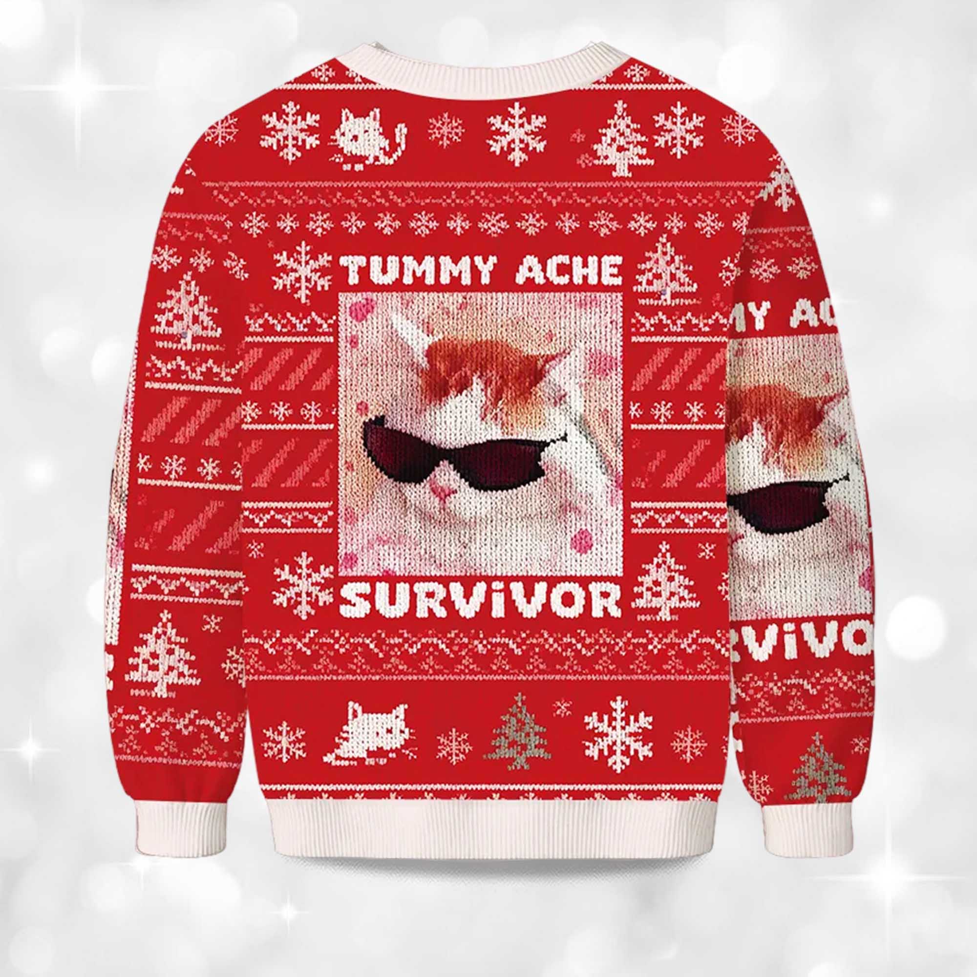 The Tummy Ache Survivor Funny Cat Christmas Ugly Sweater brings a cheerful energy with a striking red background and a cool cat wearing sunglasses. The confident pose, combined with the phrase “Stomachache Survivor,” turns a simple joke into a standout holiday moment. The playful, friendly design instantly brings a smile to any festive occasion.