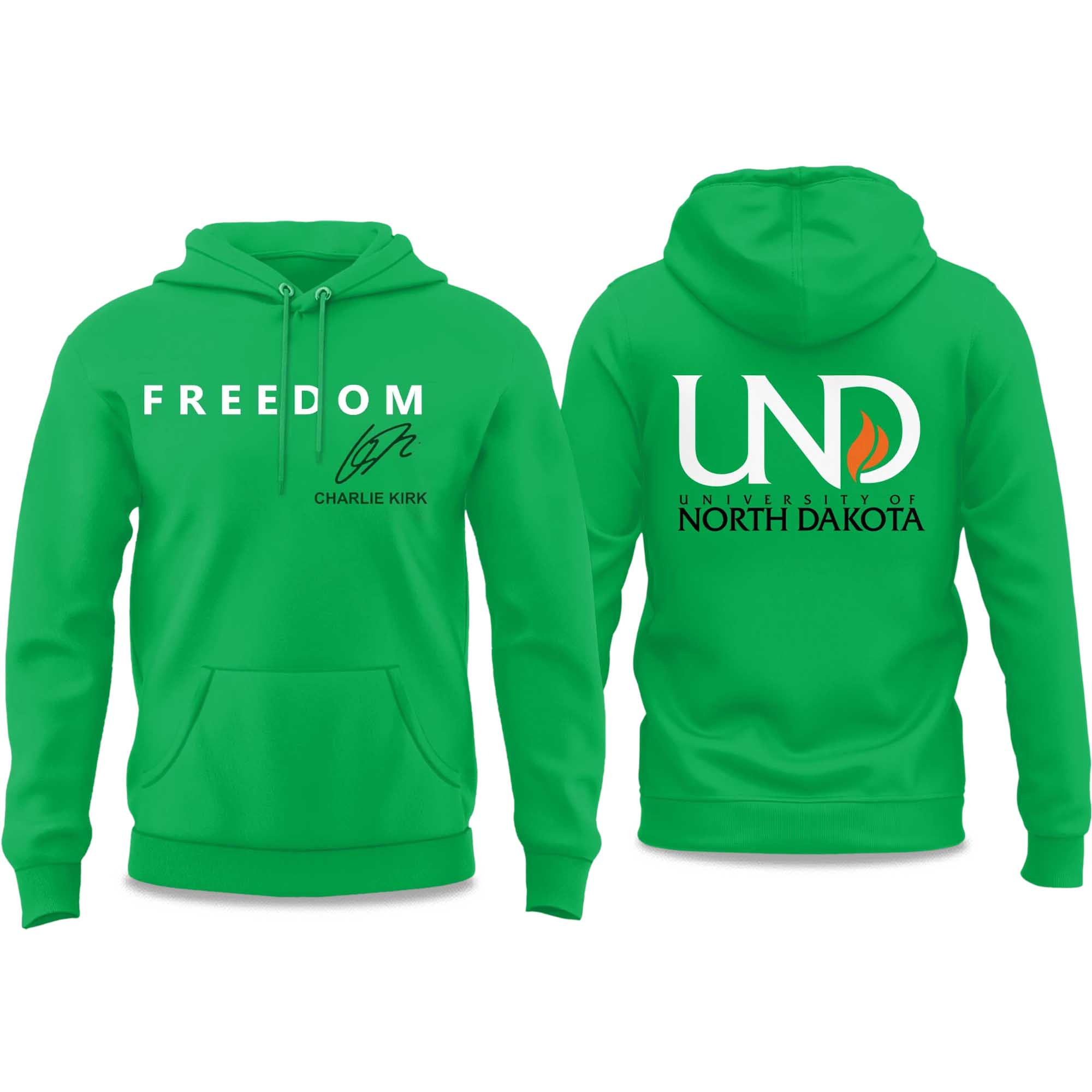 University of North Dakota Freedom Charlie Kirk 2025 Hoodie embodies the meaning of independence and leadership in the simplest, most powerful way. It represents what UND stands for — strength, unity, and the courage to fight for freedom. Perfect for students and alumni, this hoodie carries the UND spirit as we enter 2025 with pride and confidence.