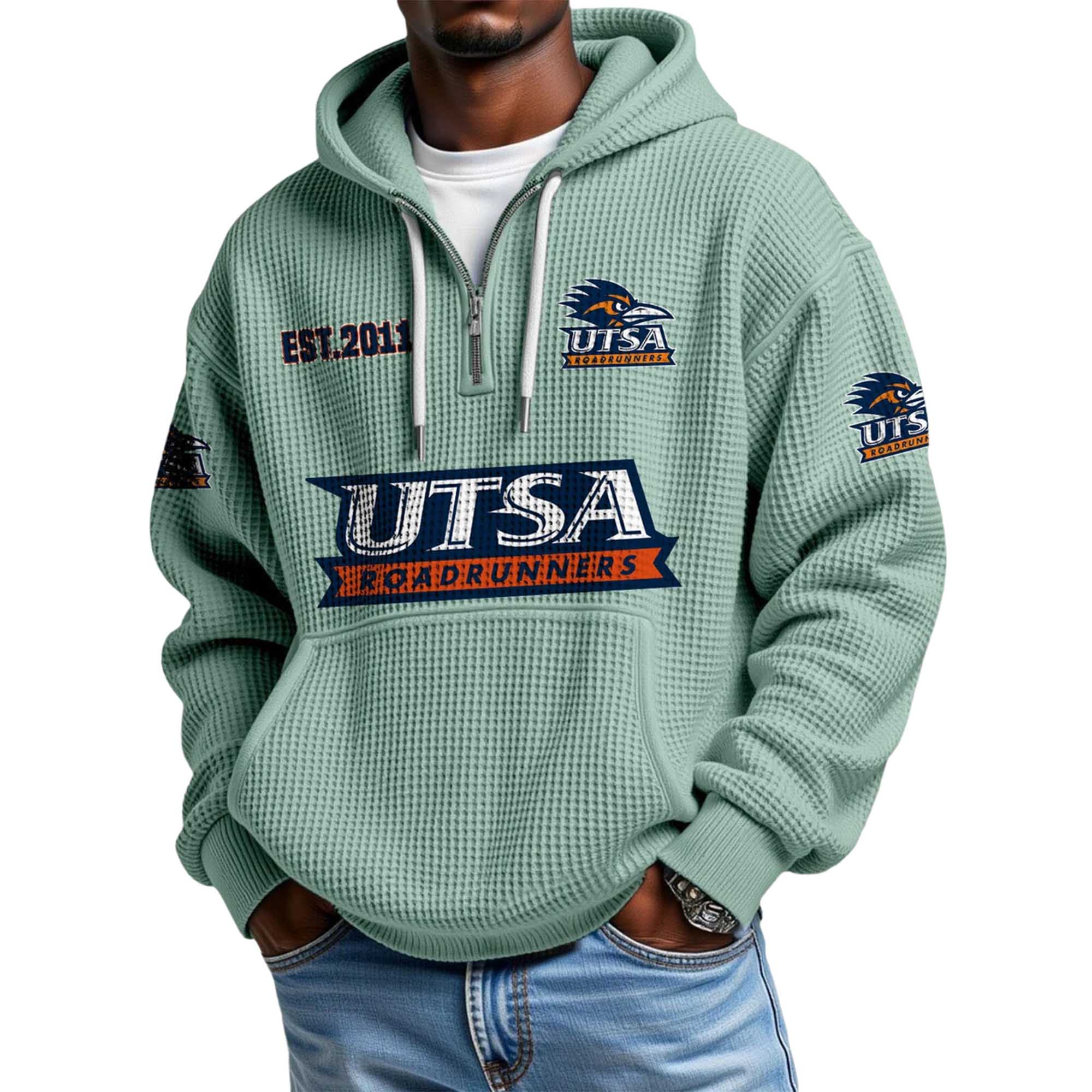 As modern college fashion continues to favor bold prints and comfortable materials, the Utsa Roadrunners EST 2011 Quarter Zip Waffle Hoodie is gaining attention. Representing one of the newest and fastest-growing universities, this hoodie reflects a youthful, dynamic spirit. It aligns with current trends that value comfortable styling, textured materials, and a strong school branding suitable for everyday living.