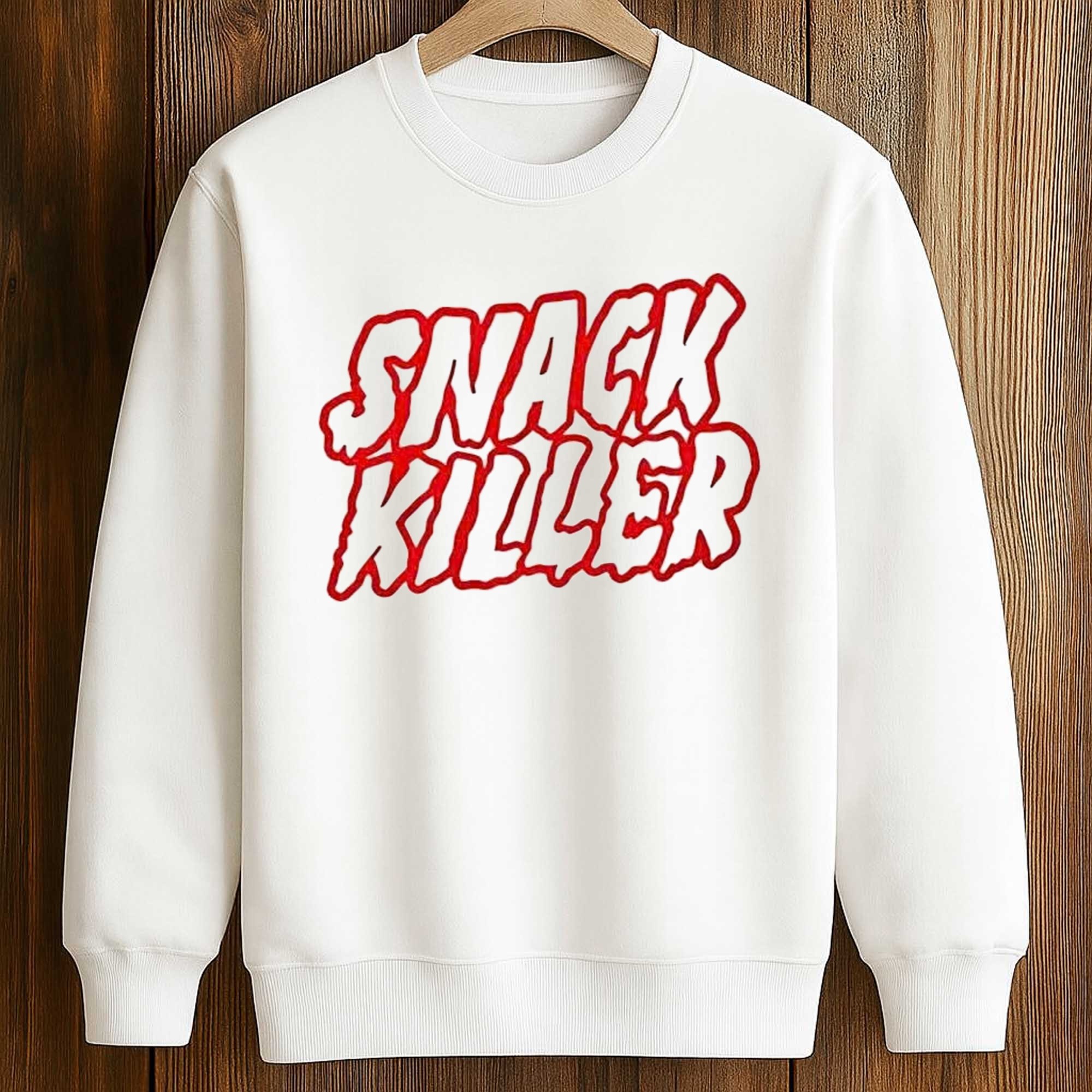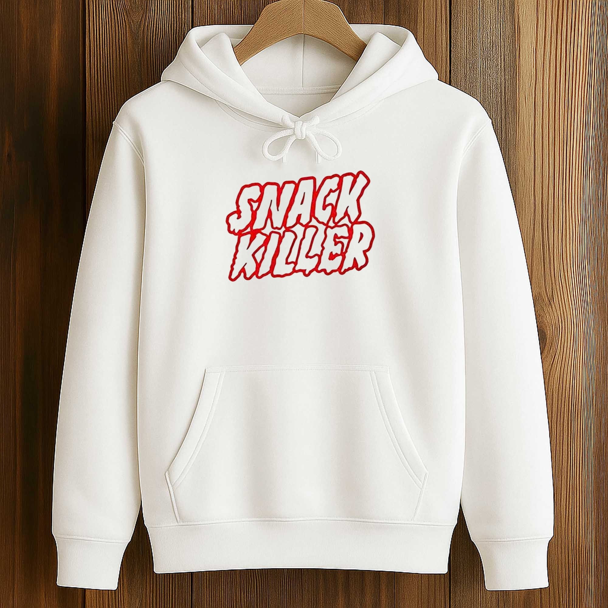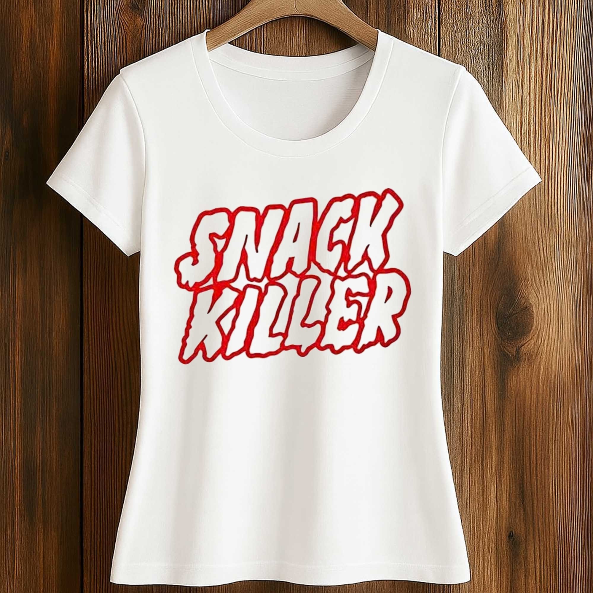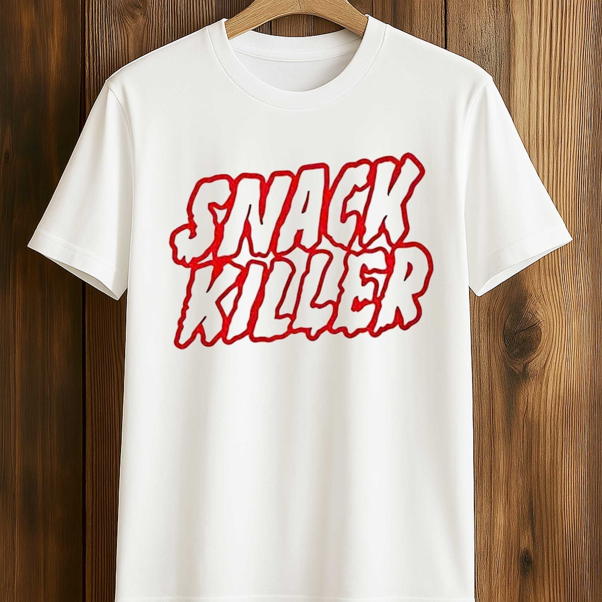 This shirt stands out with the bold red lettering of Snack Killer on a pristine white background, creating maximum contrast. The typography is playful and eye-catching without being overly complex. The balanced design makes it easy to pair with jeans, shorts, or layered outfits.