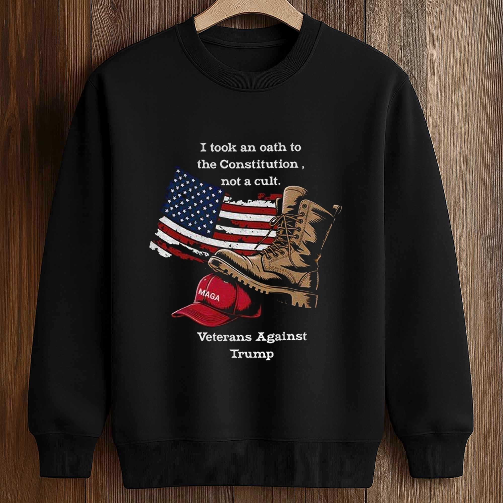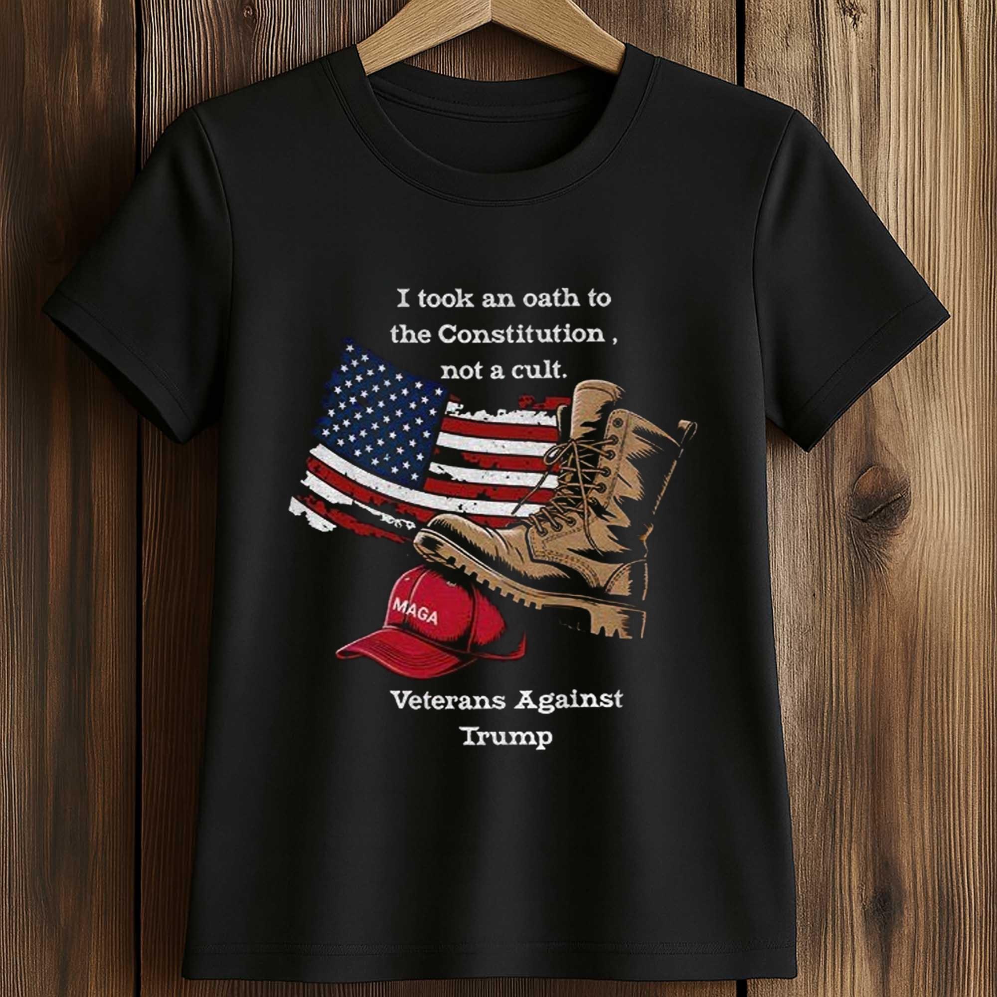 The shirt delivers its message through a powerful visual narrative. The front image features a pair of well-worn combat boots juxtaposed with a red MAGA cap, placed on the American flag a powerful image that symbolizes loyalty to the Constitution over politicians. The words “I swore an oath to the Constitution, not to a sect” are printed clearly in bold white letters, ensuring the message stands out against the black background. Made from a soft, breathable cotton blend, the shirt is comfortable for everyday wear and holds its shape through multiple washes.