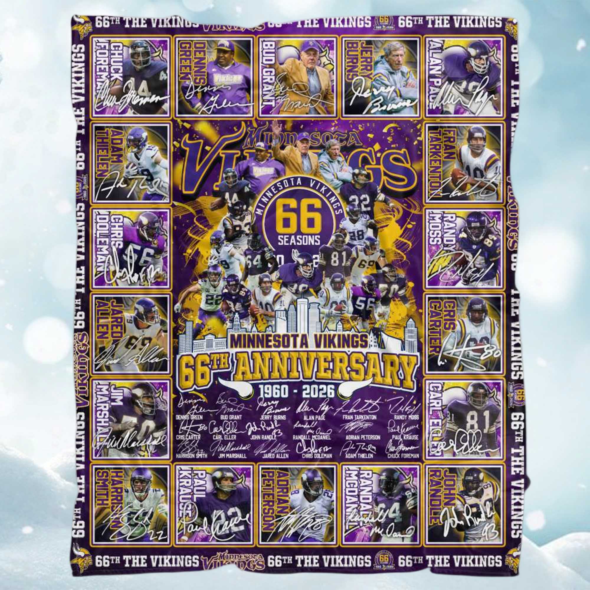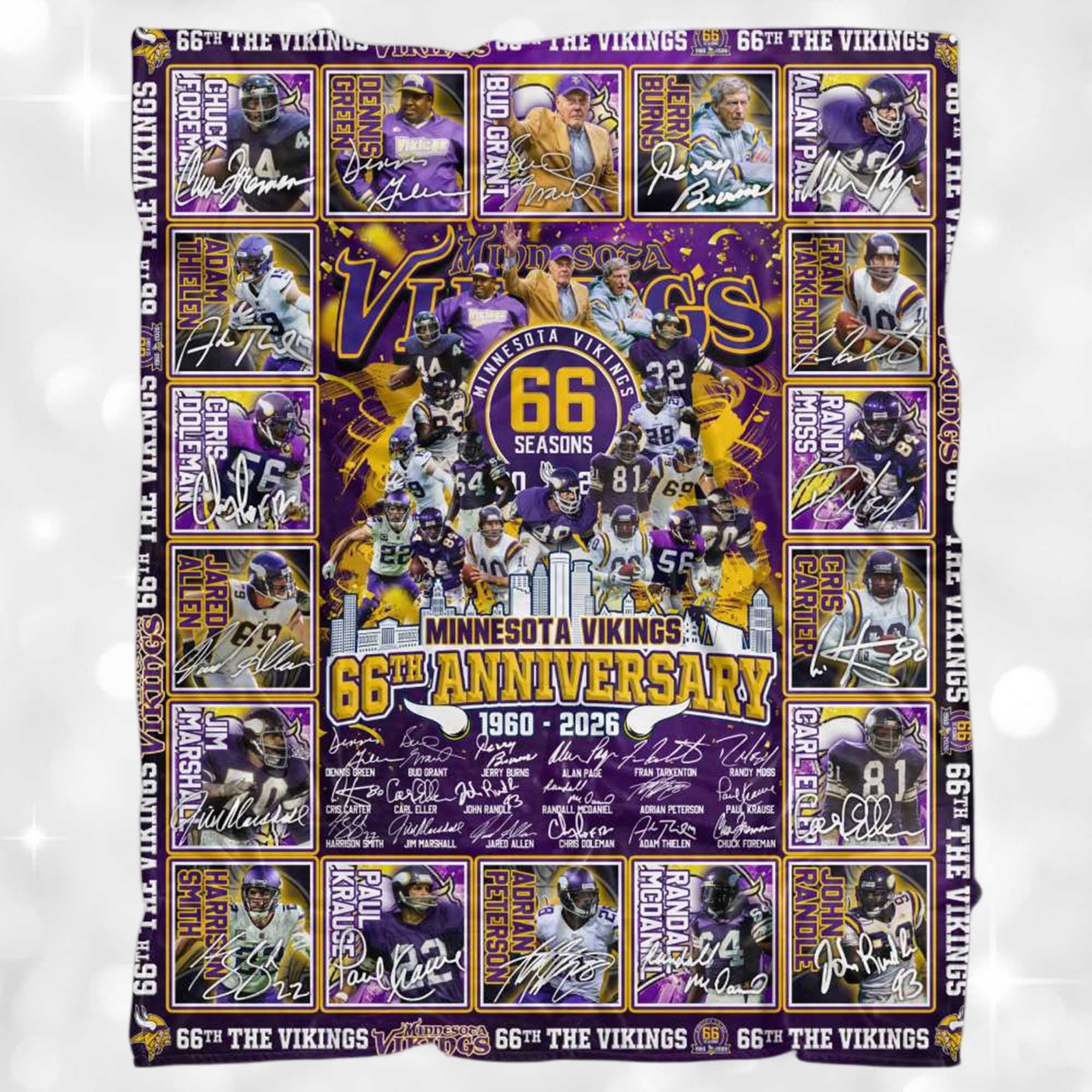 The design is inspired by the Vikings’ storied history the legendary roster, memorable seasons, and bold visual identity. The layout reflects the energy of classic playing cards and fan-favorite posters, combining modern printing with a nostalgic style. The blanket captures the spirit of the brand, taking fans on a visual journey through decades of purple pride.