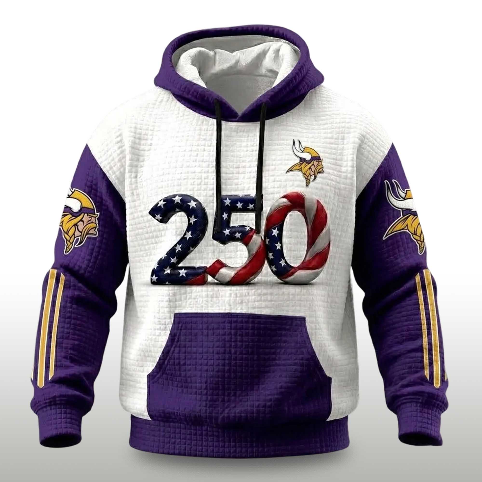 The Vikings America’s 250th Anniversary Waffle Hoodie combines Minnesota football energy and patriotism in a fresh and easy-to-wear design. Inspired by the 250th anniversary of American independence in 2026, this hoodie features the Vikings’ vibrant colors with a US flag-themed 250 number graphic on the front.