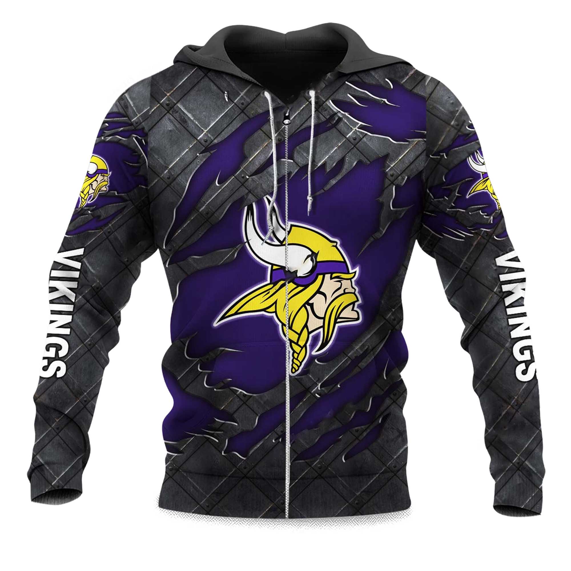 Recently, the Viking Black Metallic Pattern style has been gaining a lot of attention thanks to its rugged, cracked metal look combined with classic Viking energy. This design gives a powerful, slightly wild feel and is very suitable for street style. The Vikings Black Metal Texture Zipper Hoodie realizes that idea with its dark color scheme, purple accents, and a strong Viking image that stands out instantly without much effort.