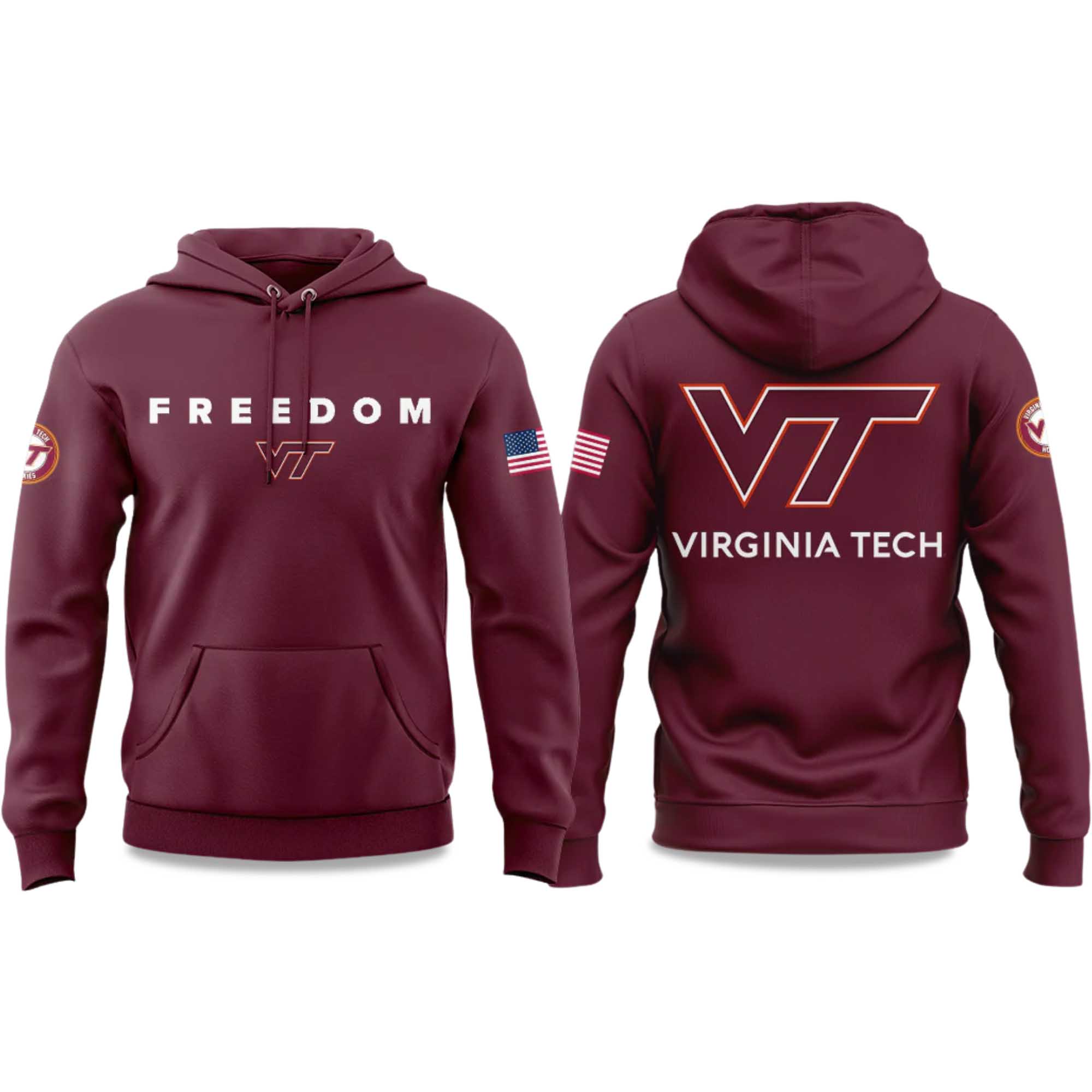 This hoodie comes in white with a burgundy and maroon print. The word ‘Freedom’ on the front grabs attention, while the large Virginia Tech logo appears on the back. The American flag on the sleeves adds a pop of color. Made from a soft commercial cotton-poly blend, the hoodie feels warm and durable, perfect for year-round wear.