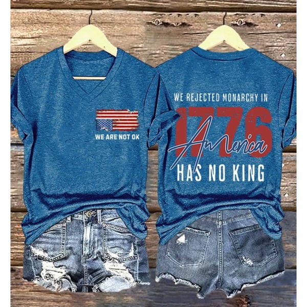 Crafted with comfort and durability in mind, this patriotic t-shirt features a vibrant blue color that makes the perfect backdrop for its bold message. The front design boldly declares “WE ARE NOT OK” while the back spells out “WE REJECTED MONARCHY IN 1776 AMERICA HAS NO KING” in attention-grabbing red text with white accents. The vintage-inspired typography adds a classic touch, fitting the message’s historical significance.