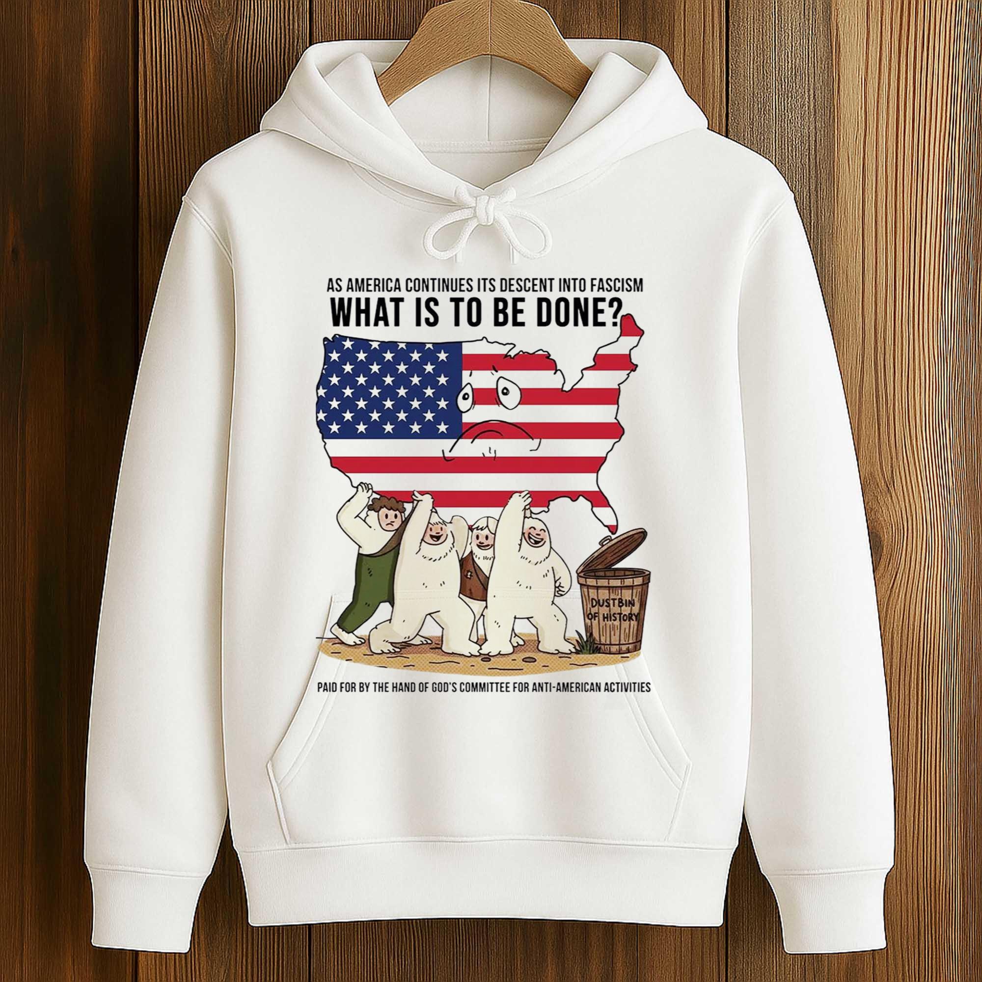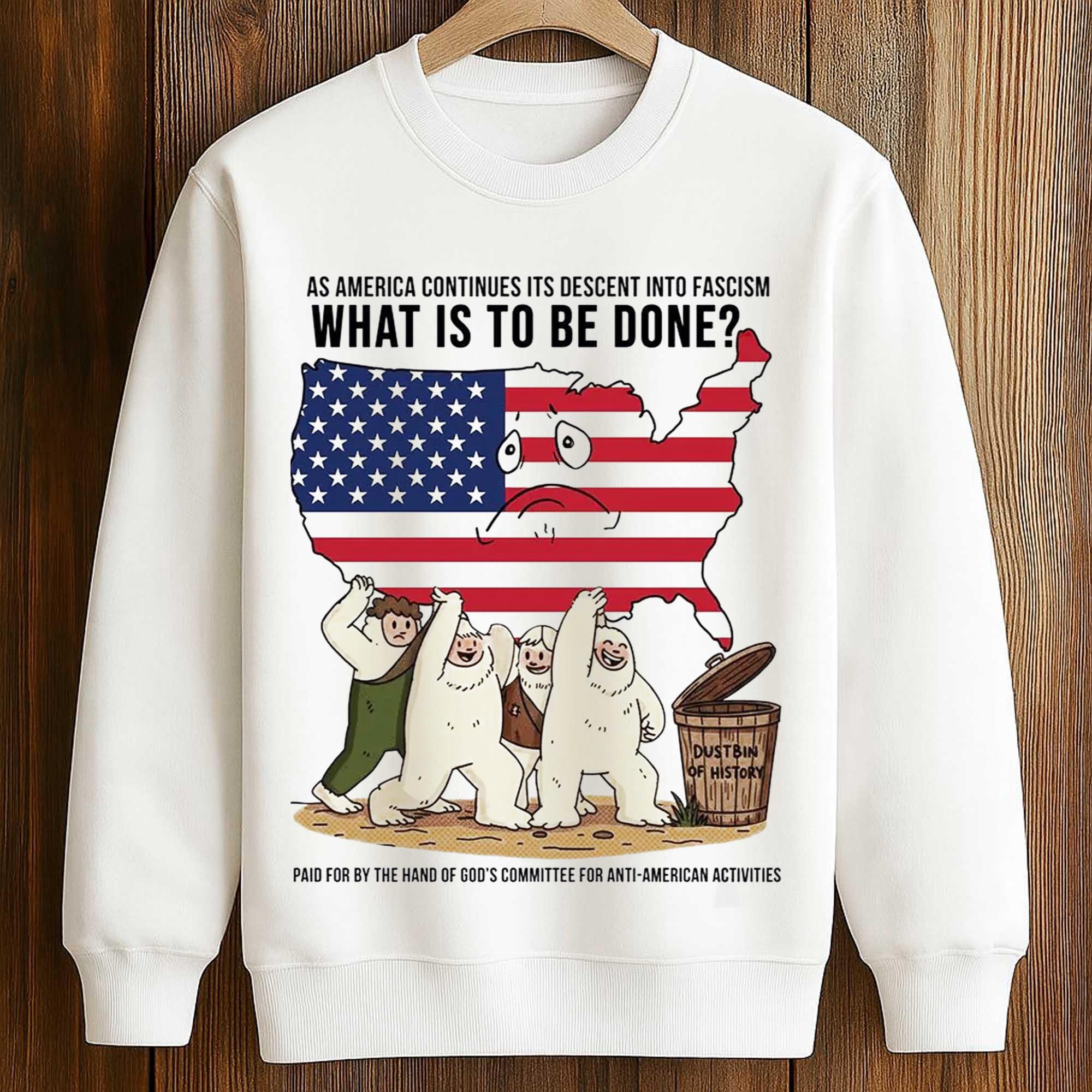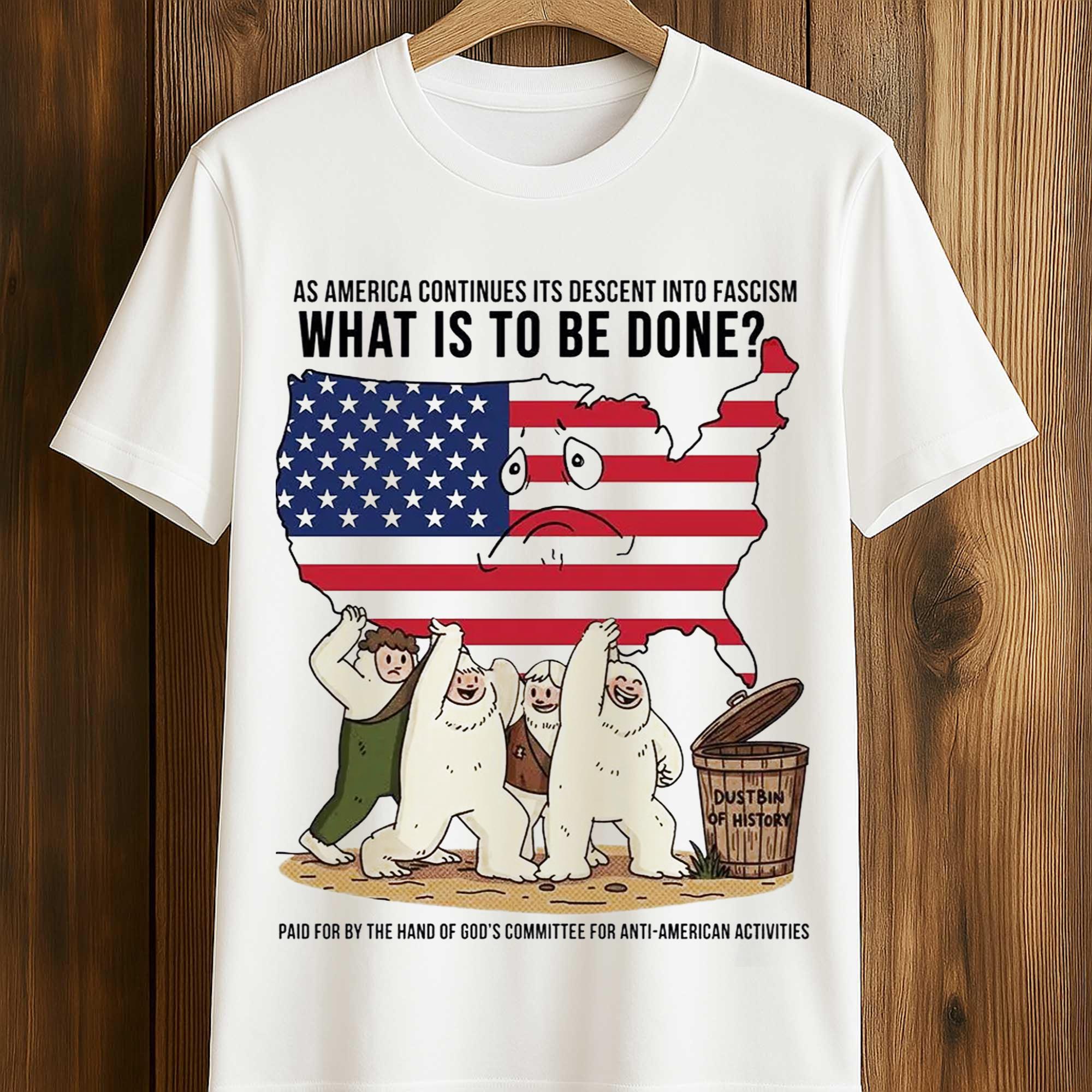 The What Is To Be Done Shirt combines humor and social commentary in a clever, eye-catching way. Featuring a disturbing American flag and a group of cartoon characters marching below, this shirt is both humorous and thoughtful. At the top of the design, the question “What Is To Be Done?” is bolded a phrase that invites conversation and reflection on modern society. This is the perfect choice for anyone who loves clever graphics and hidden satire in art.
