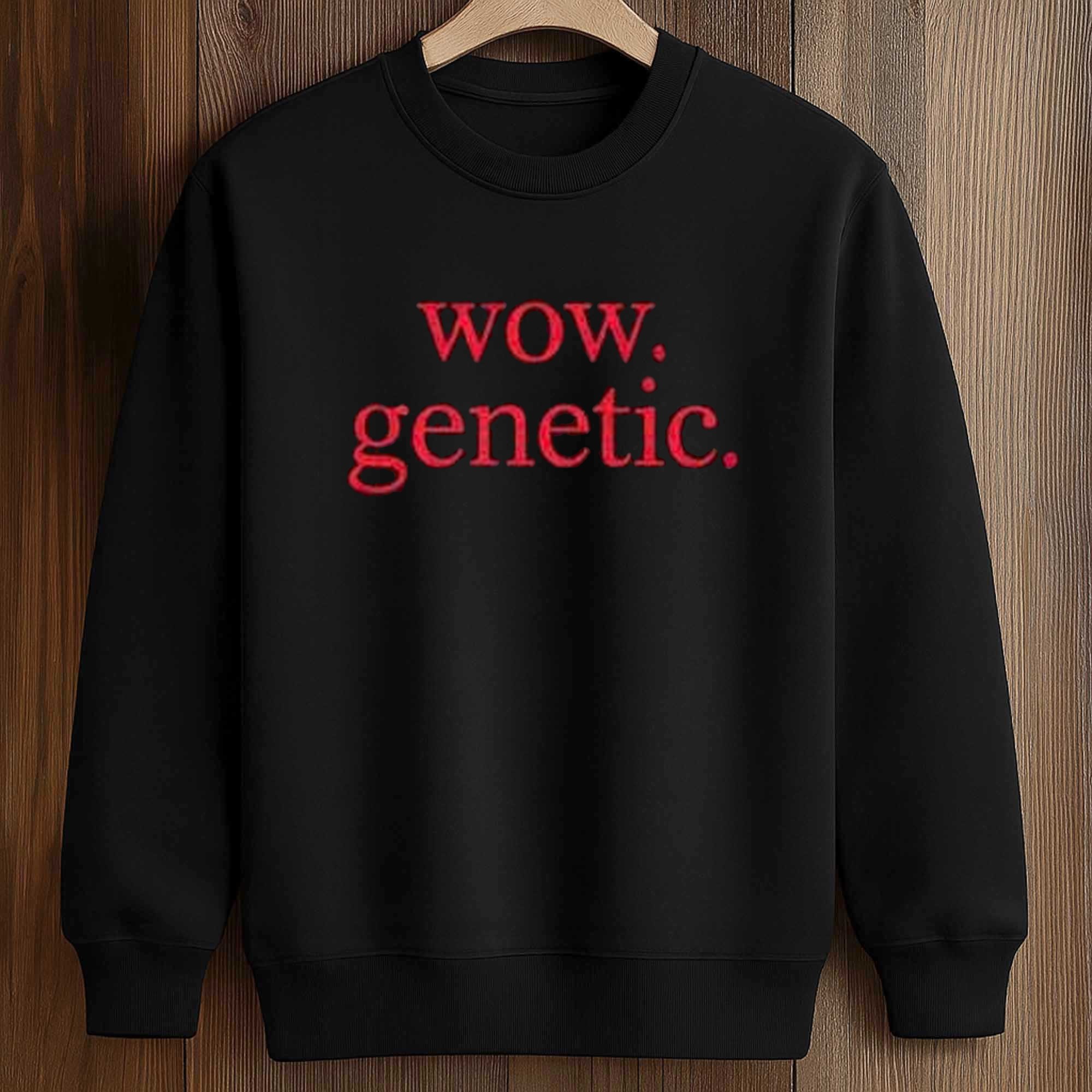 The design stands out thanks to its contrast and simplicity. The phrase Wow Genetic is centered on the chest in bold red lettering, creating a clear focal point. The spacing and punctuation give it a modern, slightly playful tone. The black background enhances visibility while maintaining overall versatility. This balance between minimalism and personality makes the shirt easy to style while still attracting attention.