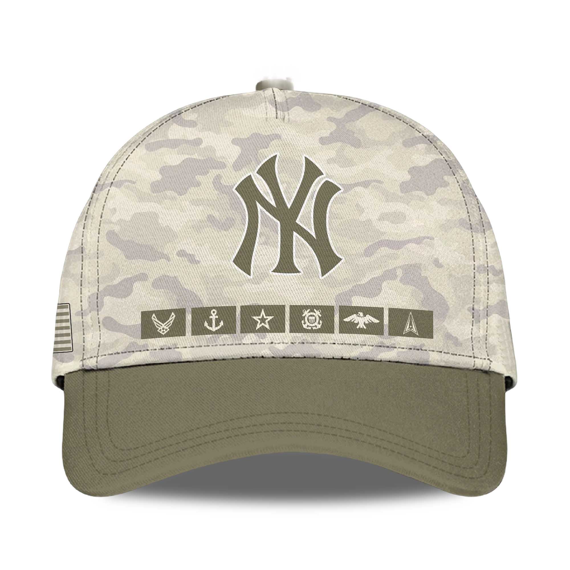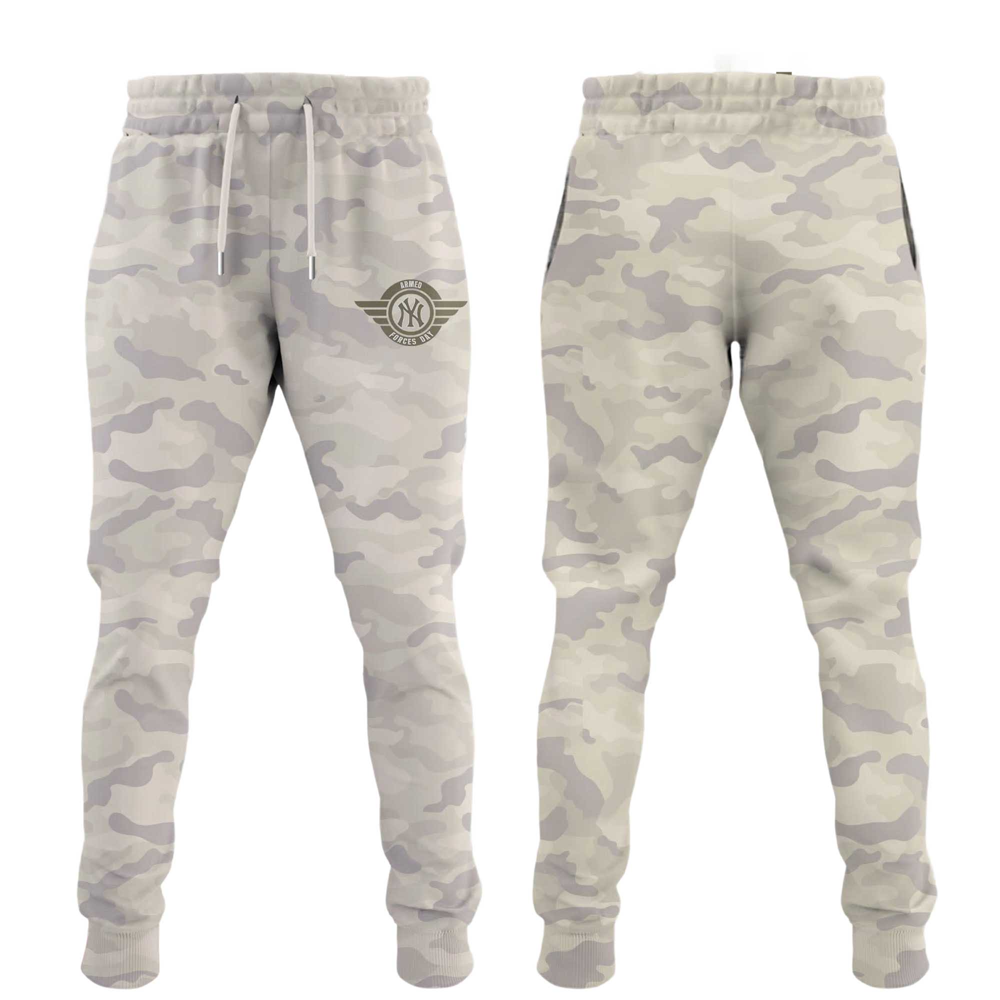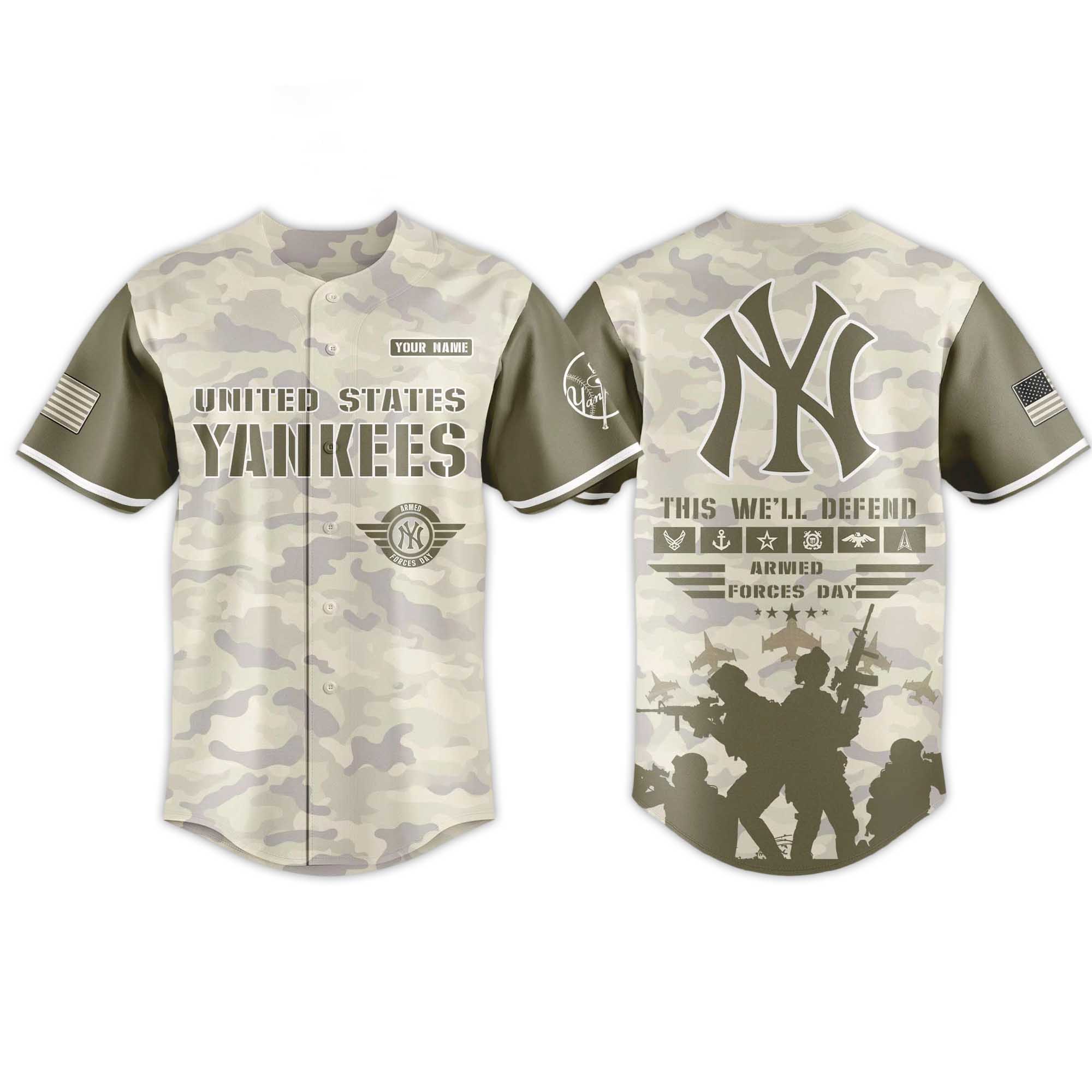 The jersey features a desert camouflage pattern with olive sleeves for a sharp, military-inspired contrast. The bold United States Yankees lettering on the chest creates a powerful focal point. A flag patch on the sleeve adds a patriotic touch and completes the celebratory theme. On the back, a large NY logo stands out above the This We’ll Defend lettering, followed by an impressive silhouette honoring military personnel. The elegant color palette and iconic Yankees logo create a strong, formal, and instantly recognizable jersey.