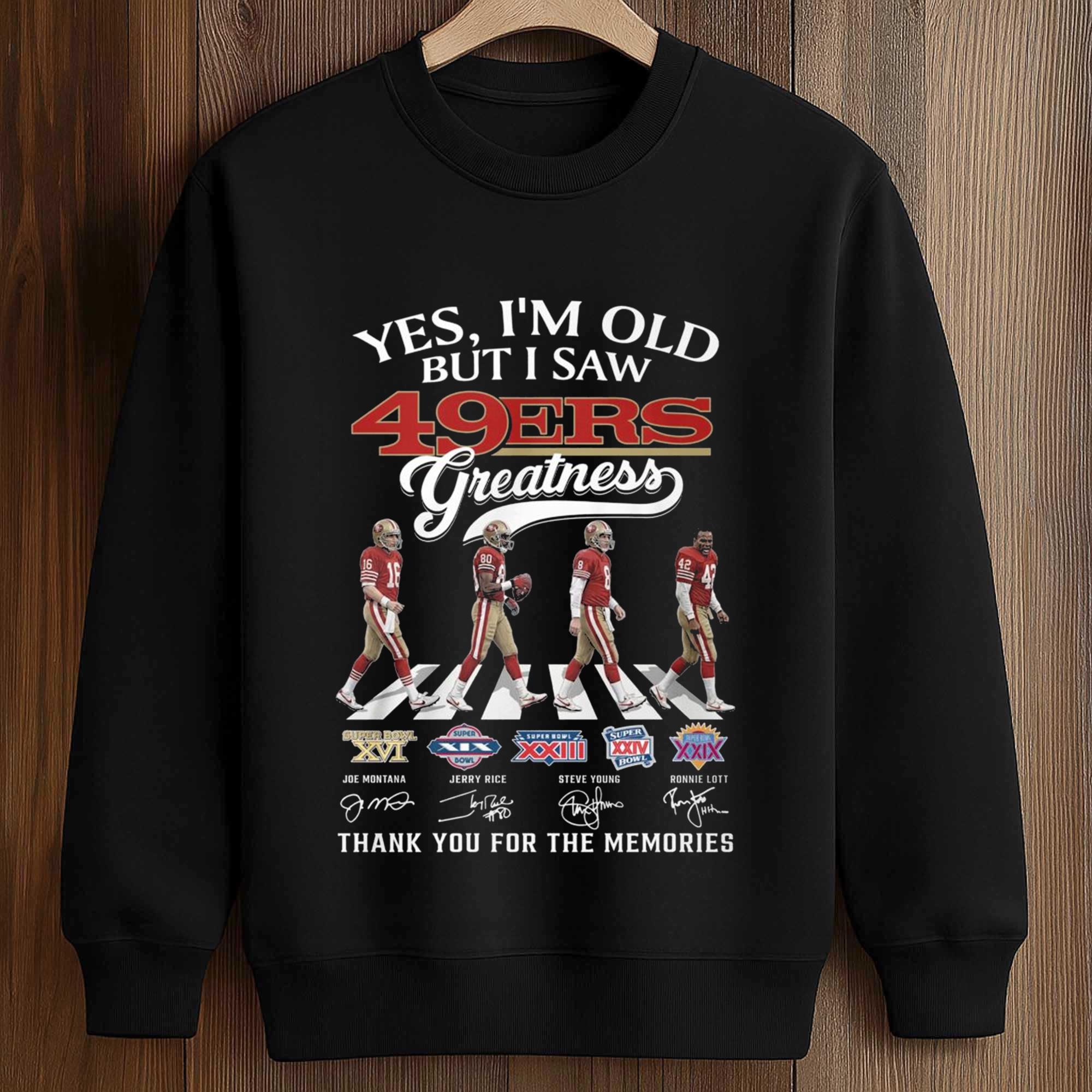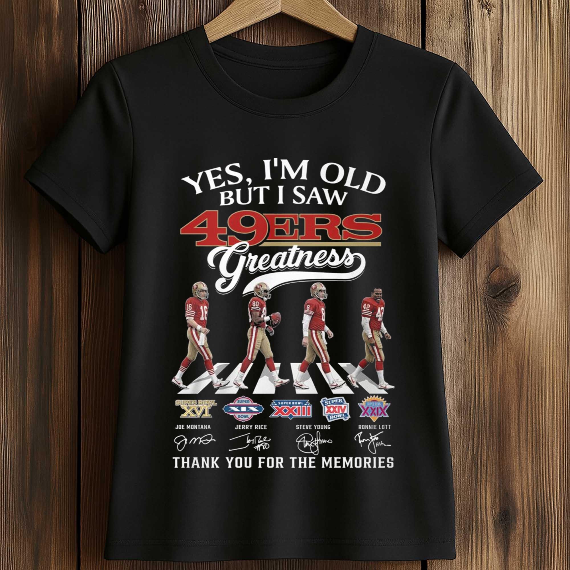 The Yes, I’m Old But I Saw 49ers Greatness Thank You For The Memories Shirt brings classic football memories into everyday wear. The strong black background highlights the bold red and yellow lettering, while the illustrated player images create a smooth visual timeline of legendary eras. It’s designed for fans who remember championships, decisive plays, and the emotions that came with them.