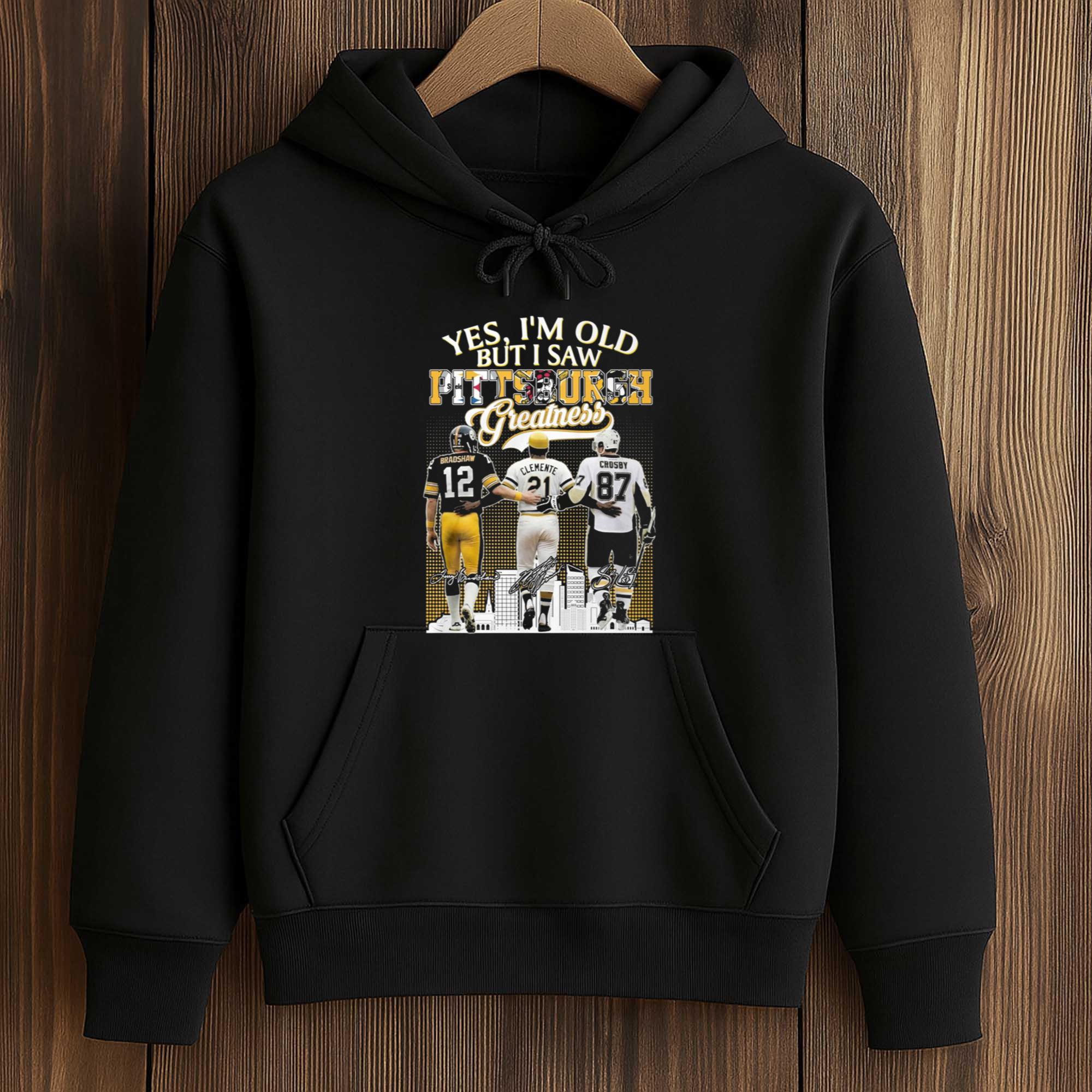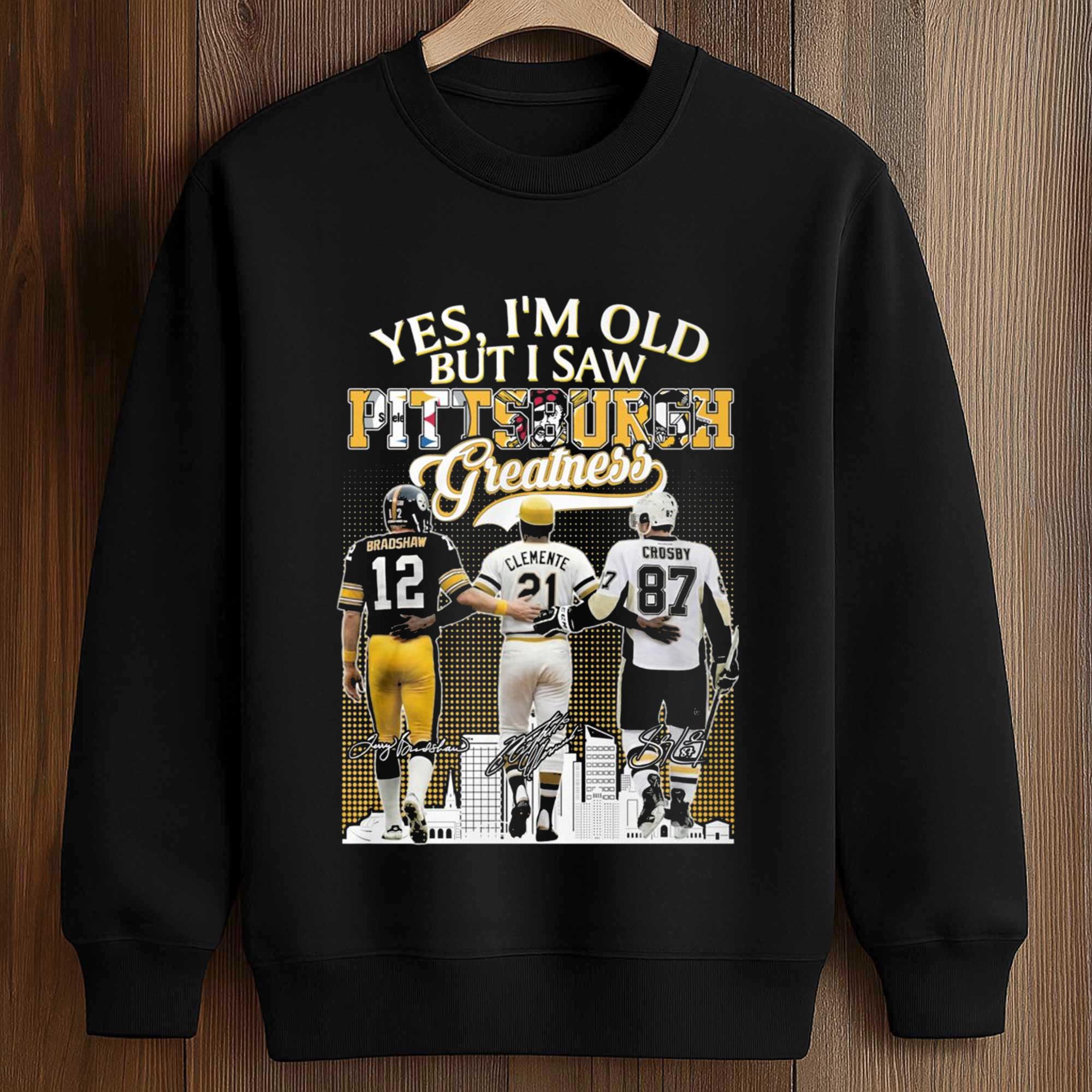 The Yes, I’m Old But I Saw Pittsburgh Greatness Shirt a striking headline combined with an impressive collage of iconic figures from Pittsburgh’s sports history. The layered imagery creates depth while keeping the message clear and easy to read. The balanced layout allows the characters and typography to blend seamlessly without feeling visually overwhelming. This shirt is designed for everyday wear but still holds strong emotional value for longtime fans.