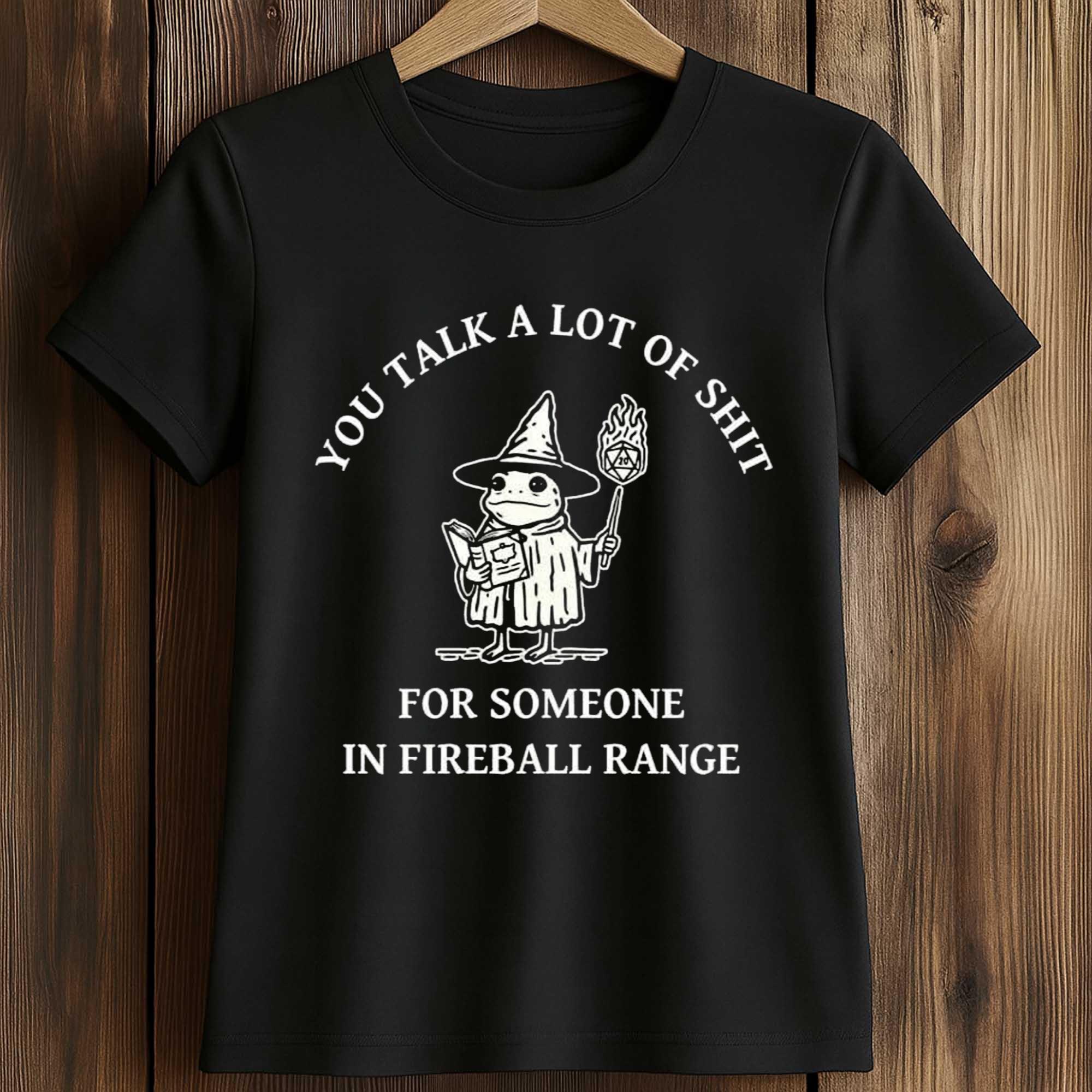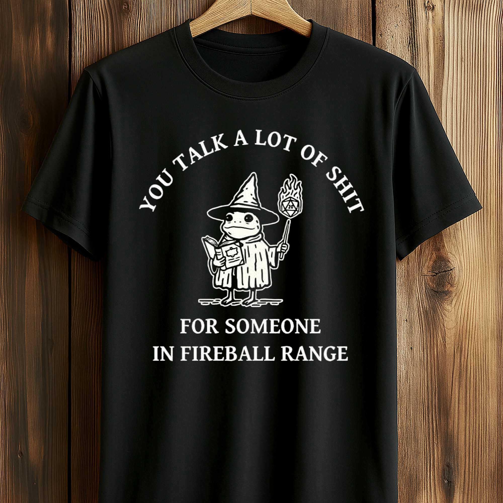 The You Talk A Lot Of Shit For Someone In Fireball Range Shirt reflects the growing popularity of fantasy-inspired humor in everyday fashion. As board games, culture, and online memes continue to influence style, t-shirts with witty, exaggerated quotes are gaining attention. This design instantly connects with fans who appreciate clever jokes rooted in the magical world and playful banter.