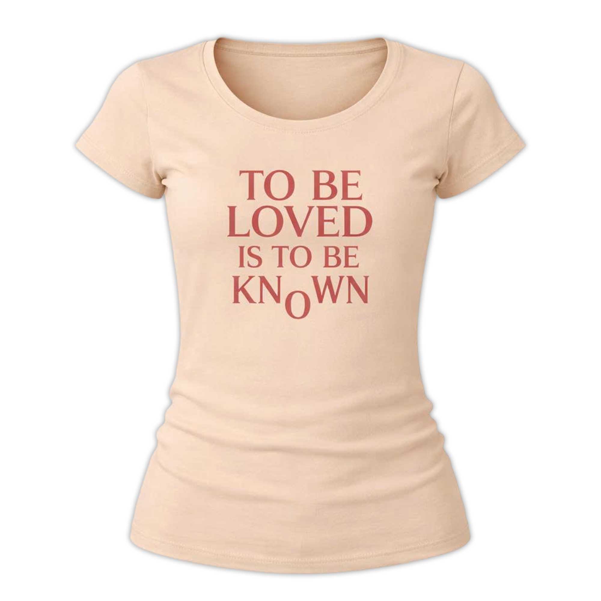 This shirt features the elegant phrase Being Loved Is Being Known printed in a sophisticated serif font. The balanced layout creates a clean, elegant, and expressive visual style. Warm pink lettering on a soft, neutral background creates a graceful contrast, suitable for both casual and formal wear. The minimalist design focuses on the message, making the shirt both fashionable and emotionally profound.