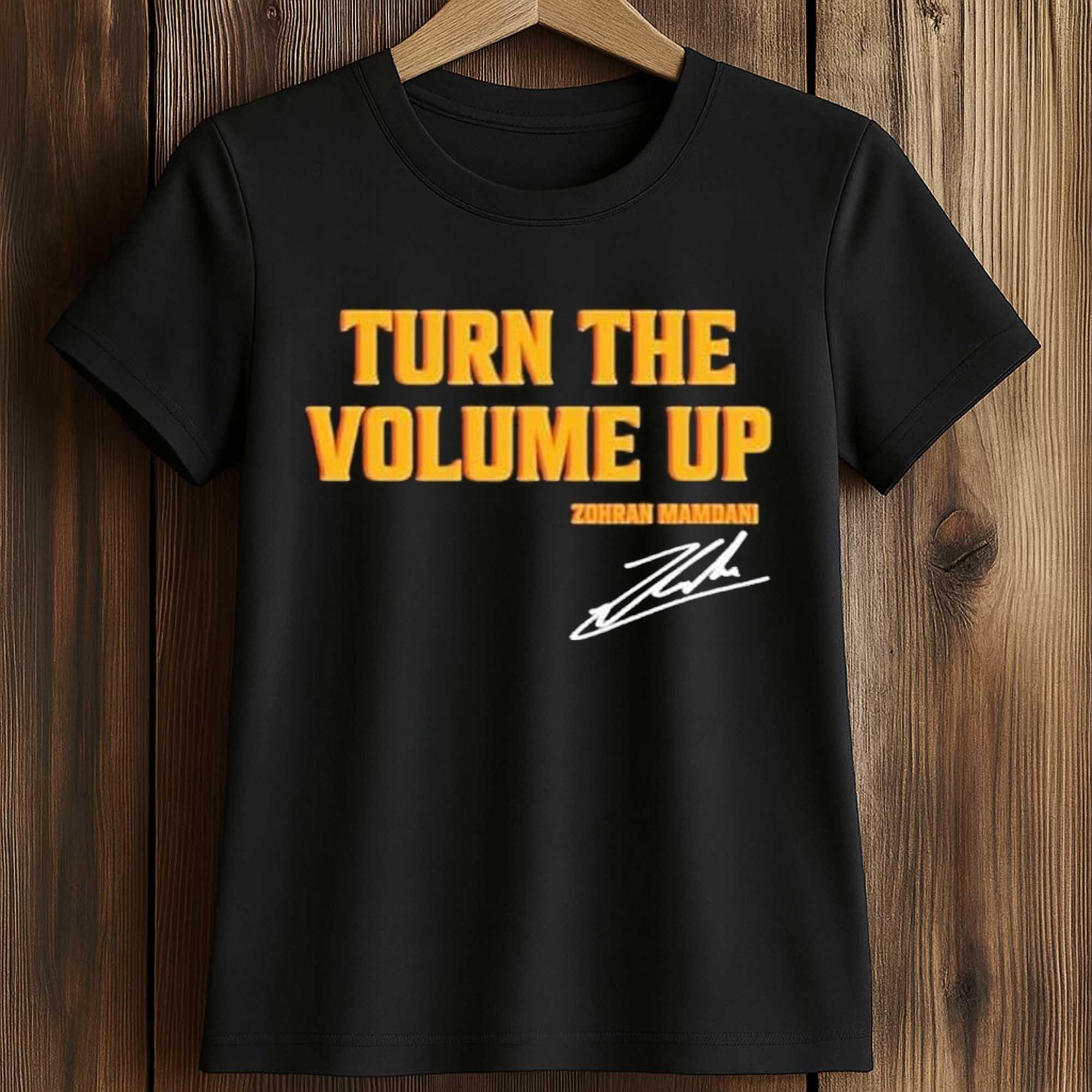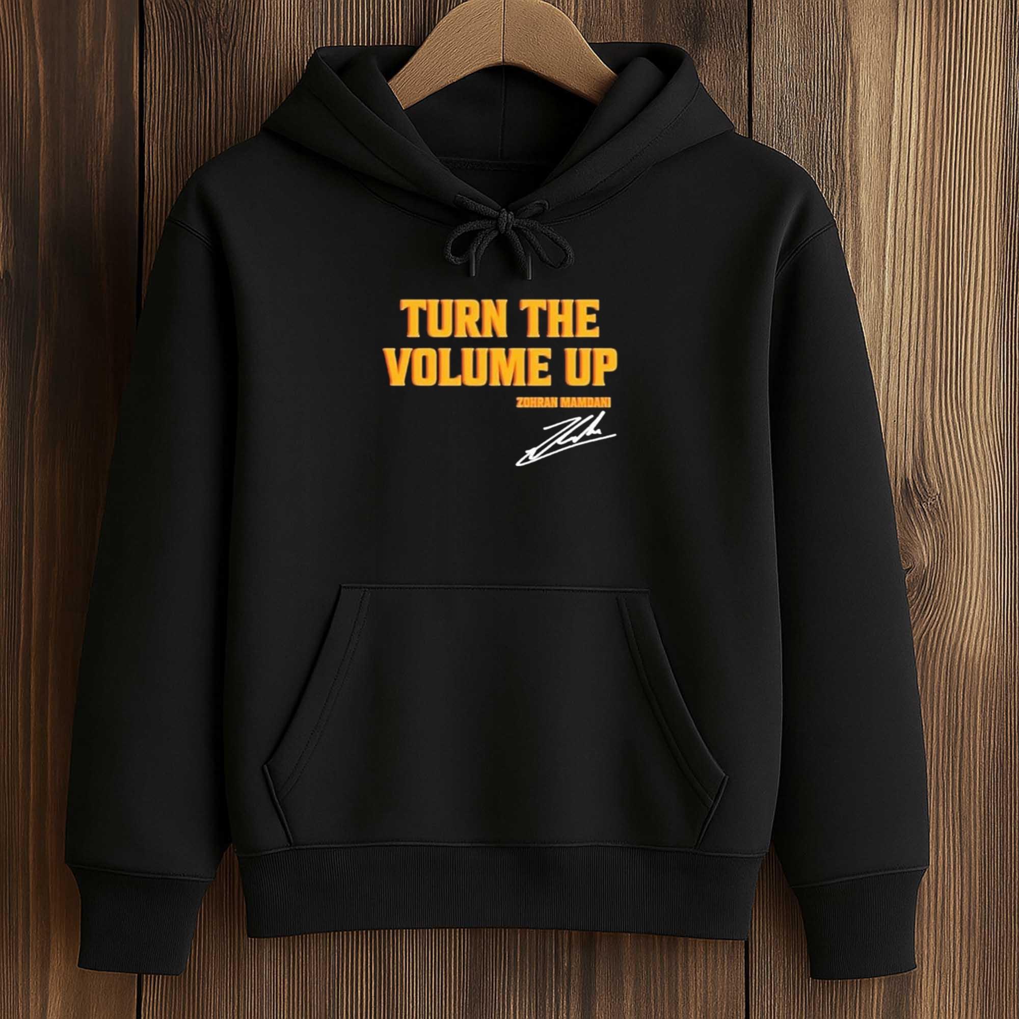 The design is simple yet bold: large, all-caps yellow lettering that spells out “TURN THE VOLUME UP,” a smaller line under Zohran Mamdani’s name, and a bold white signature underneath. The black background highlights the letters, giving you a strong, confident feel. With a relaxed fit and smooth texture, the shirt feels comfortable on your skin and stays in shape after wash after wash. It’s both stylish and edgy, perfect for anyone who loves a statement-making style.